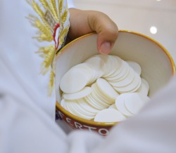 Holy Communion, or the Holy Eucharist, is the bread and wine which is consecrated (blessed) and through transubstantiation (a transformation of substance) becomes the Body and Blood of Christ that we share at the celebration of Holy Mass. It is important to note that one of the main differences between the Catholic faith and other Christian denominations is that we believe the Eucharist to be not a symbol, but truly Christ present before us in body, blood, soul and divinity. This follows the call from Jesus to his disciples at the Last Supper when He broke bread and shared it saying 'this is my Body', and similarly with the cup saying 'this is my Blood', and said after each to 'do this in memory of me'.